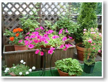 | ベランダ正面。 まだ二番花が咲かないキュートイエロー、バーベナなど…。 |