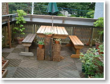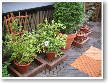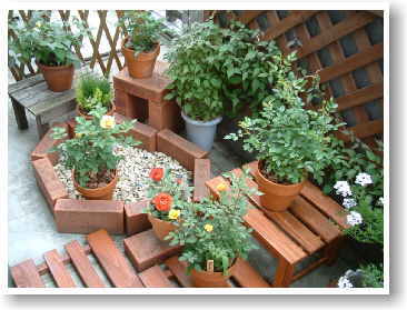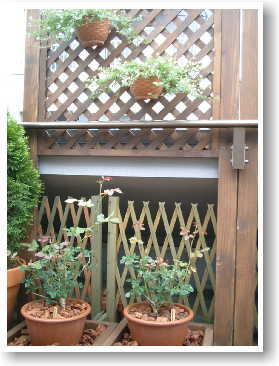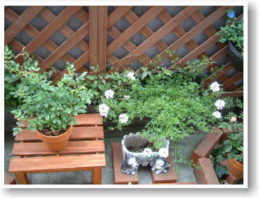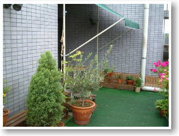 | ルーフバルコニー北側です。 ここにバラのアーチを作るのが夢です。 左右に見えるのは、ハナミズキ。白とピンクです。 |