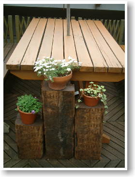 9年前に二人で作ったテーブルとベンチ。 その時以来ご無沙汰だったDIYですが、突如復活。 なぜか枕木大好きなM。 テーブルの横に並べて花代にしてみました。 |