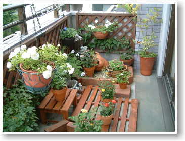 | ベランダ全体。 ベランダの半分は、洗濯物干し場と割り切って未開拓です。 半分だけでガーデニング。 水道も無いから、これ以上増やすと水遣りも大変。 ミニバラは主にこちらで…。 |