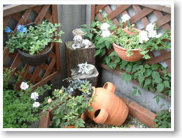 ←の右側。 バレリーナ、つるサマースノーなど…。 Mが作ったグッズは、ガーデニングショーでヒントを得たとか…。 まだどう使うか検討中です。 |