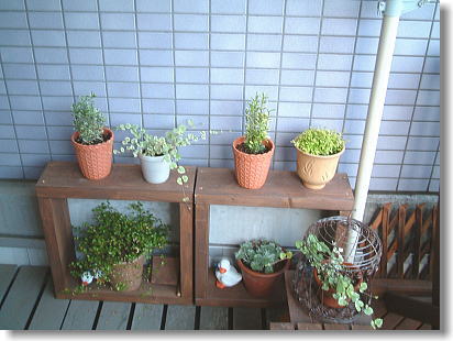 | 出入口左手。旦那が作った枠に小さい鉢物をディスプレイしてみました。 |