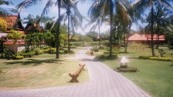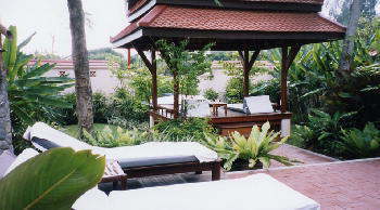 | こんなに立派なお庭がそれぞれのビラにあります。 日焼け用ベッド、サーラと呼ばれるあずまや、 その向こうには、プライベートジャグジーがあります。 |