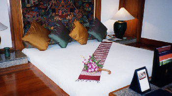 | 素敵にアレンジされたペッド。 タイシルクのクッションが雰囲気をかもし出しています。 ペッドサイドには、アロマグッズが・・・。 |