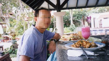 実は、右側の子と2ショットを狙っていた旦那。 どういう訳か左の子も入ってきて、3ショットに。 従ってチップも二人に渡さねばならなくなりました。(^_^;) 誰と写真を撮りたいか、自分で決めたのですが、 う〜ん、旦那の趣味って…?(ーー;) |